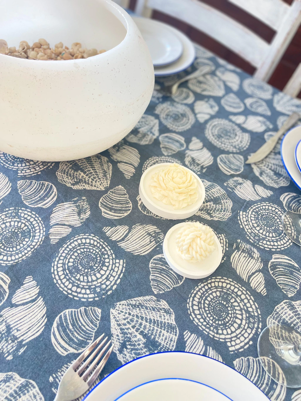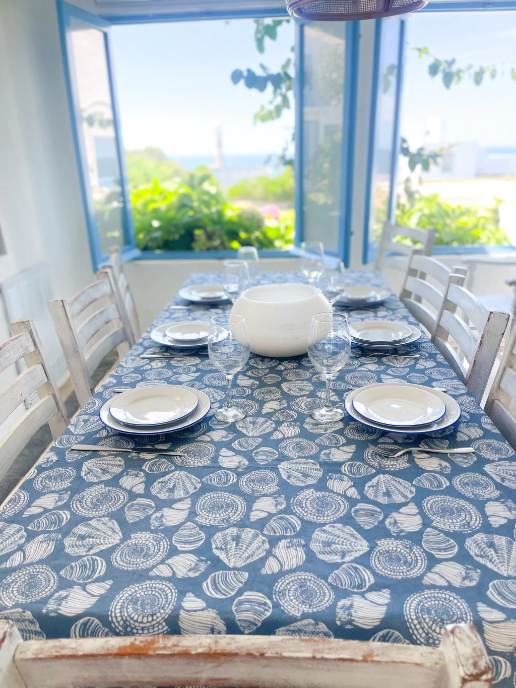 Mantel de tusor 100% algodón base color acero, estampa color crudo.