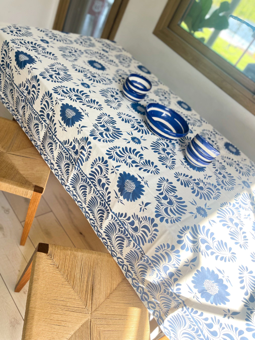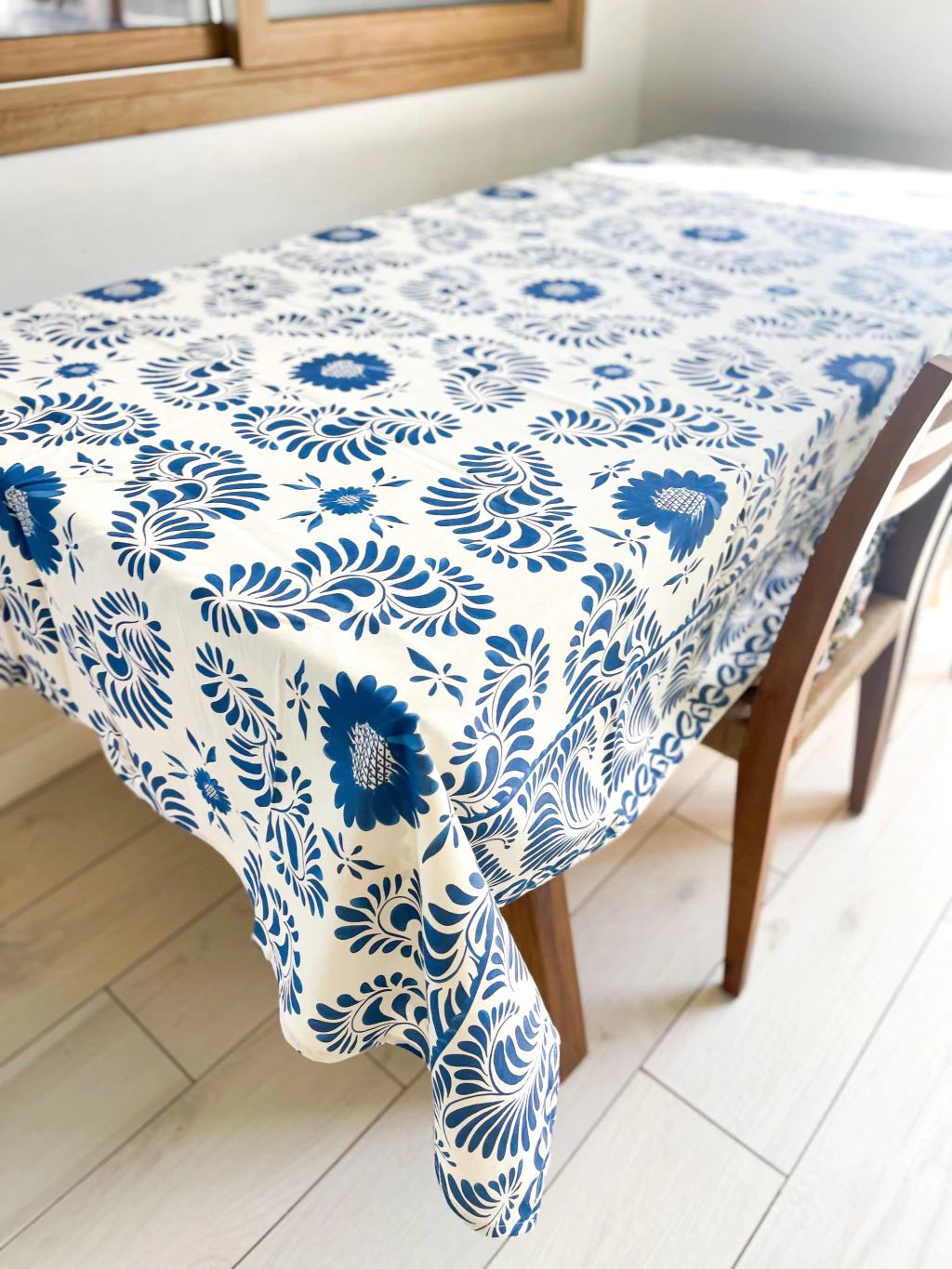 Mantel de tusor 100% algodón base color crudo, estampa color azúl.