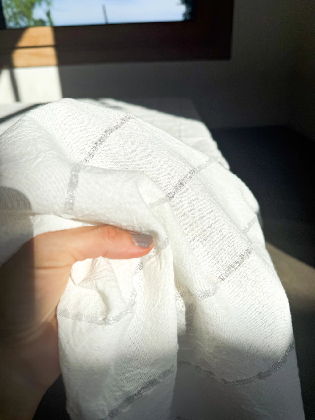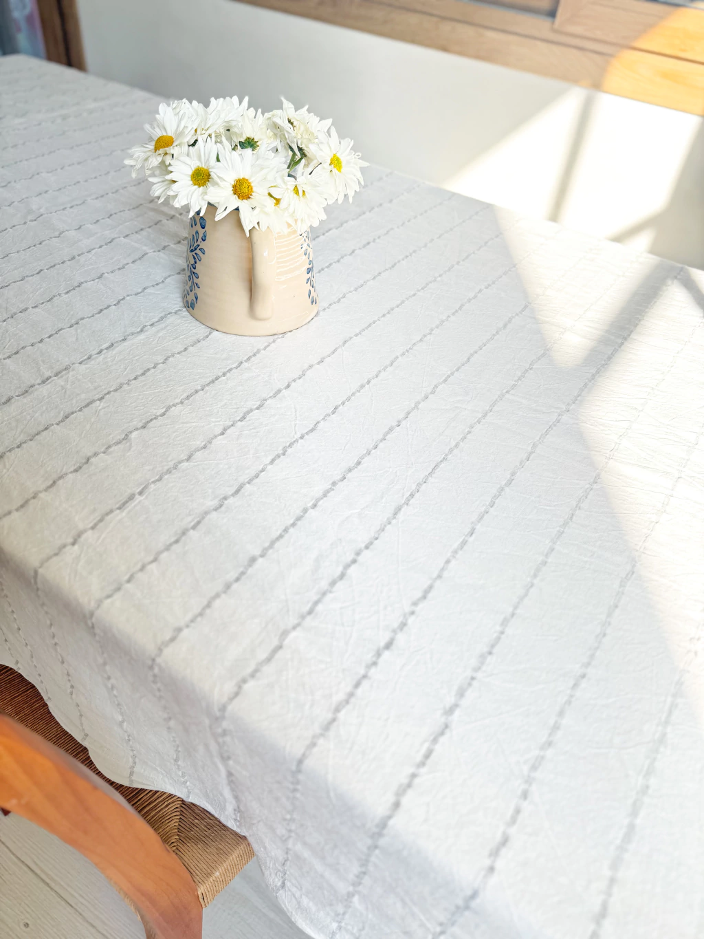 Mantel tusor 95% algodón base color crudo, lineas en lurex plateado.